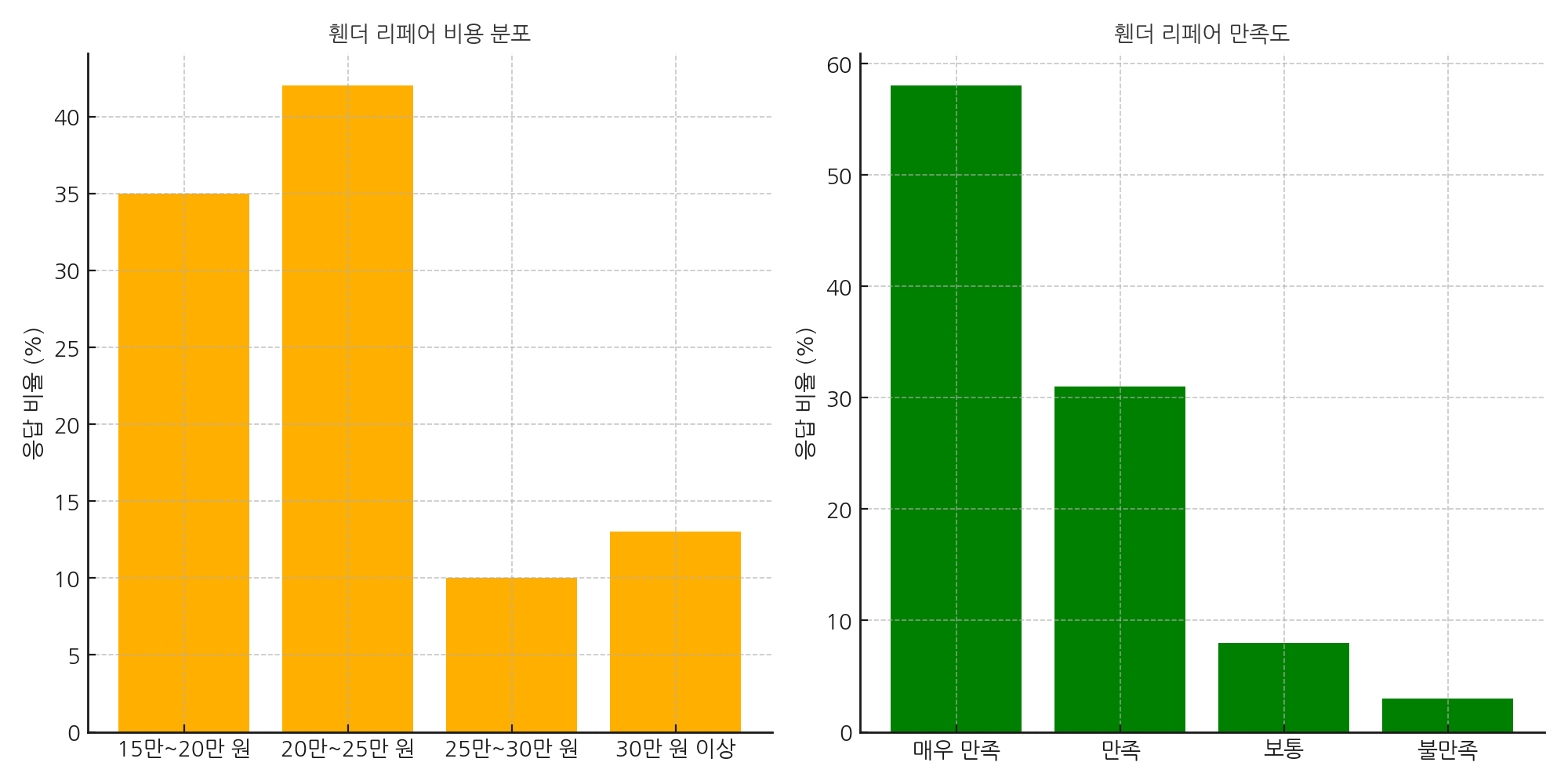 실제 소비자들이 경험한 휀더 리페어 비용과 만족도를 기반으로, 어떤 상황에서 리페어가 선택되는지 시각적으로 정리해 봤어요. 특히 리페어 만족도는 4.5점 이상으로 매우 높았고, 평균 비용도 20~25만 원대로 형성되어 부담이 크지 않았어요.